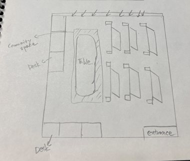 Next, we addressed the need for a dedicated communication zone. Previously, collaboration happened outside the lab, at individual desks, or via messaging—none of which were ideal. By relocating shelves to the right side, we freed up enough space to create a central area for meetings, discussions, and study sessions. Desks were repositioned along the lower and left walls, making better use of the available space.
